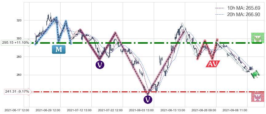 ♘ 阻力价格位295.15,可信任强度98.35%,距离最后交易2021-09-09 14:00形成的收盘价格265.66相差 +11.10%