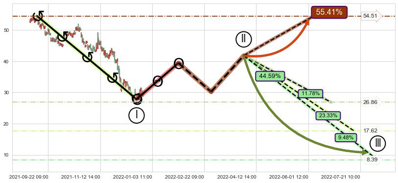 从2021-08-02 09:00至2021-12-21 13:00,共包含681个小时,阶段股价下跌-54.80%,阶段股价变动位移路程比: 1 : 9,下跌趋势角度: 31.1,2021-08-27 09:00向↘︎形成缺口,跳空下跌-14.34%˚