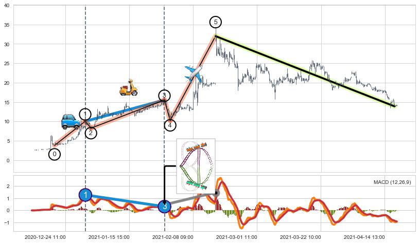 从2020-11-17 10:00至2021-02-23 09:00,共包含450个小时,阶段股价上涨286.18%,阶段股价变动位移路程比: 1 : 4,2021-02-16 09:00向⇪形成缺口,跳空上涨+60.00%