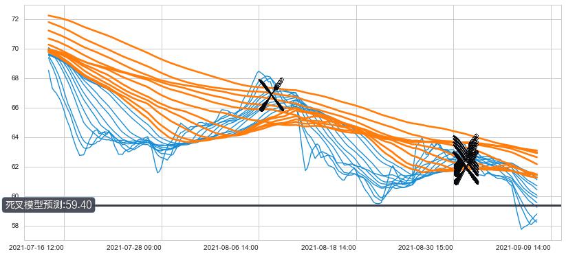 ➣ 70小时均线于(08-31 14:00: 61.84)形成【死叉】基于【死叉历史模型】预测死叉后最低波谷价格: 58.12, 死叉后最低价格57.43,已经下跌超出预测最低波谷价格, 预期反弹