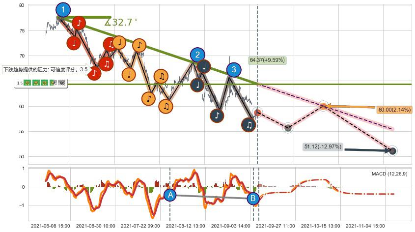 ♘ 在最后的下跌阶段2021-06-03 09:00至2021-09-09 14:00,存在 持续未破位的阻力位 ,阻力价格64.37,可信任强度79.10%,其距离最后价格58.74相差 +9.59%