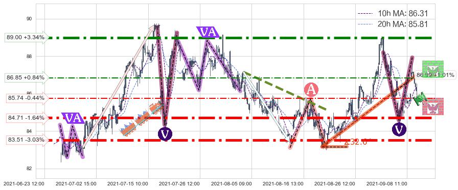 ♘ 阻力价格位89.00,可信任强度97.13%,距离最后交易2021-09-09 14:00形成的收盘价格86.12相差 +3.34%