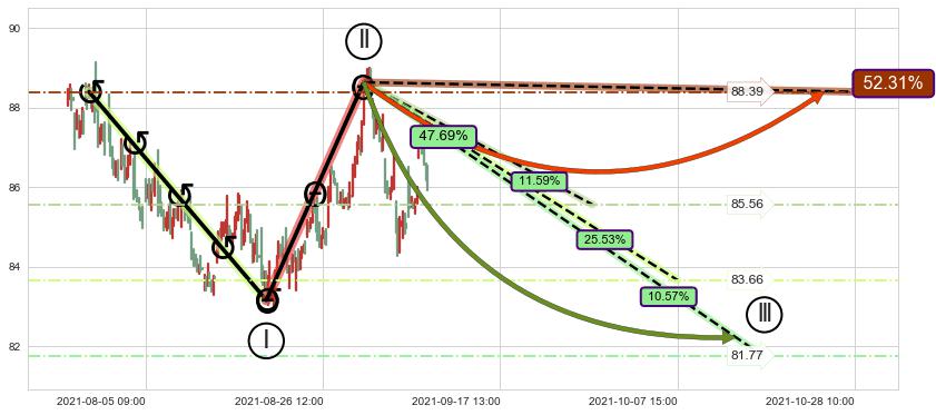 ➣ 循环浪继续向下【平均值】位置(10-07:15, 83.66),匹配聚类样本比例53.54%, 可能性概率25.53%