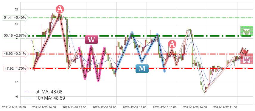 ♘ 阻力价格位50.18,可信任强度93.32%,距离最后交易2021-12-27 15:00形成的收盘价格48.77相差 +2.87%