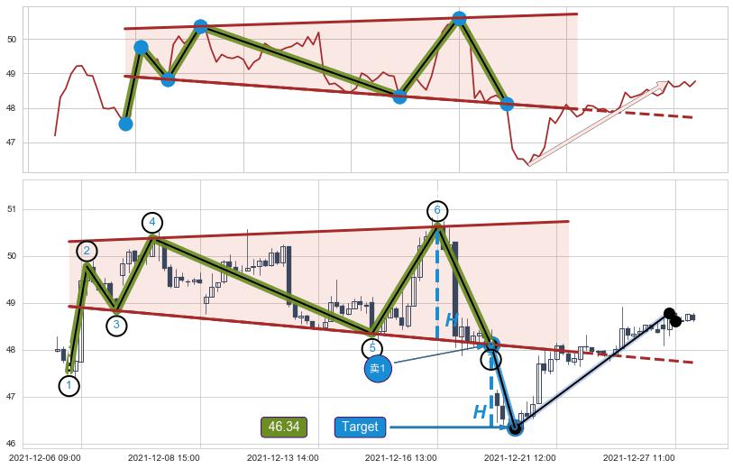 从2021-12-02 13:00至2021-12-13 14:00,共包含51个小时,阶段股价下跌-1.39%,阶段股价变动位移路程比: 1 : 19