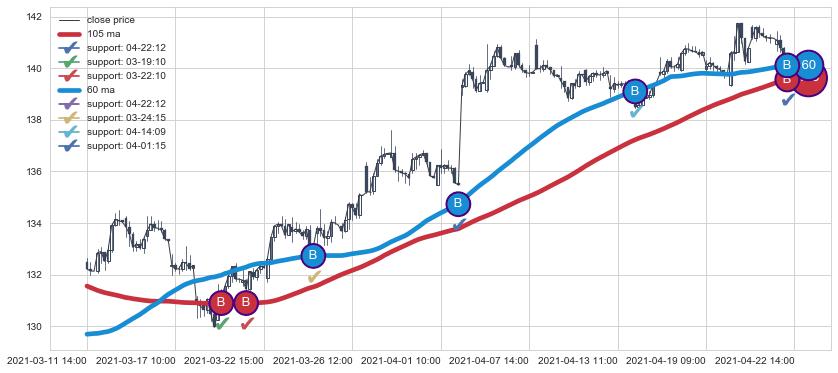 ➢ 最优均线组合共正确确认支撑阻力信号16处,正确确认率 69.57%