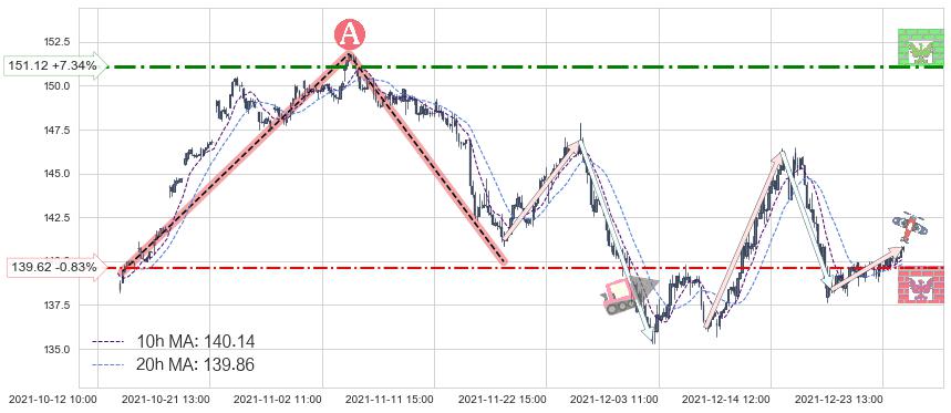 ♘ 支撑价格位139.62,可信任强度45.30%,距离最后交易2021-12-27 15:00形成的收盘价格140.79相差 -0.83%
