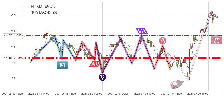 ♘ 支撑价格位44.15,可信任强度90.61%,距离最后交易2021-07-20 14:00形成的收盘价格45.31相差 -2.58%