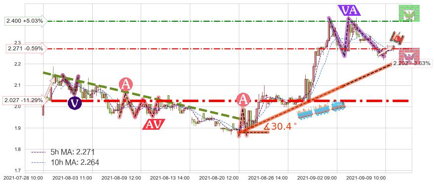 ♘ 阻力价格位2.400,可信任强度55.00%,距离最后交易2021-09-09 14:00形成的收盘价格2.285相差 +5.03%