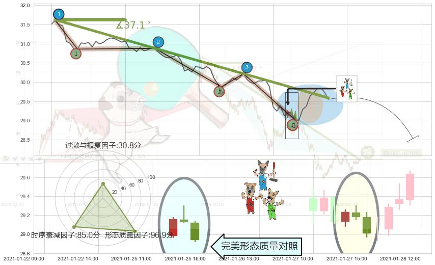 从2021-01-14 14:00至2021-01-28 13:00,共包含72个小时,阶段股价下跌-5.68%,阶段股价变动位移路程比: 1 : 3,下跌趋势角度: 37.1