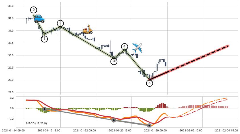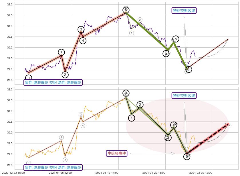 ➣ 波浪理论:猜想击穿破位c点后继续下跌 → 下跌 → 风险信号 → 小趋势跟踪