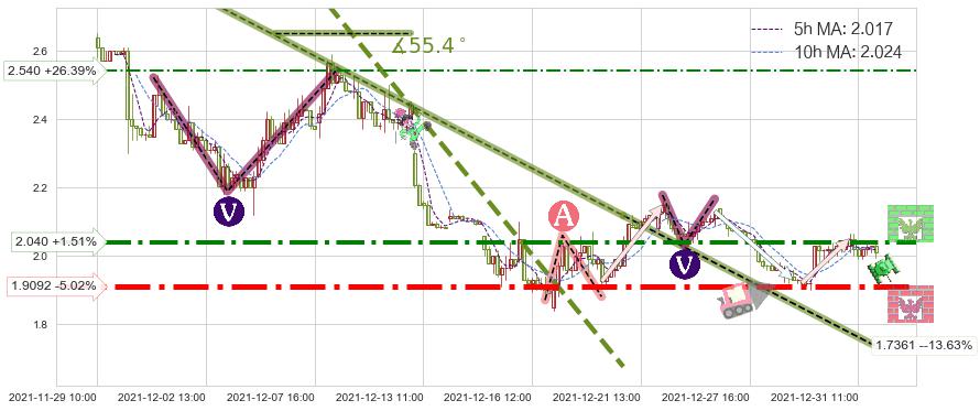 ♘ 阻力价格位2.040,可信任强度82.86%,距离最后交易2021-12-31 15:00形成的收盘价格2.010相差 +1.51%