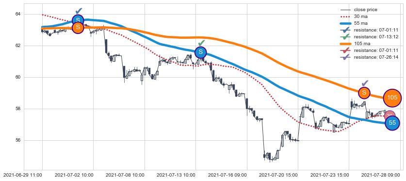 ➢ 105小时均线于(07-02 13:00: 63.15)形成【死叉】基于【死叉历史模型】预测死叉后最低波谷价格: 61.33, 死叉后最低价格52.38,已经下跌超出预测最低波谷价格, 预期反弹
