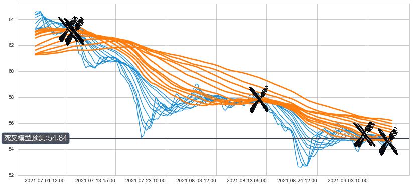 ➣ 60小时均线于(08-11 15:00: 57.72)形成【死叉】基于【死叉历史模型】预测死叉后最低波谷价格: 55.64, 死叉后最低价格52.38,已经下跌超出预测最低波谷价格, 预期反弹