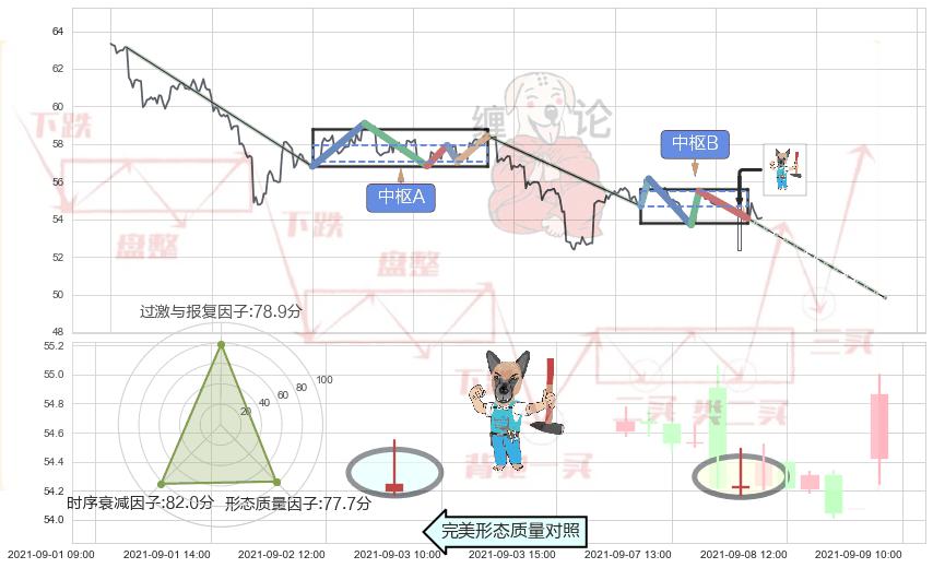 ➣ 【中枢B】:08-26:14-09-08:14,中枢由5笔构成,共54交易小时, ZG=55.49, ZD=54.70