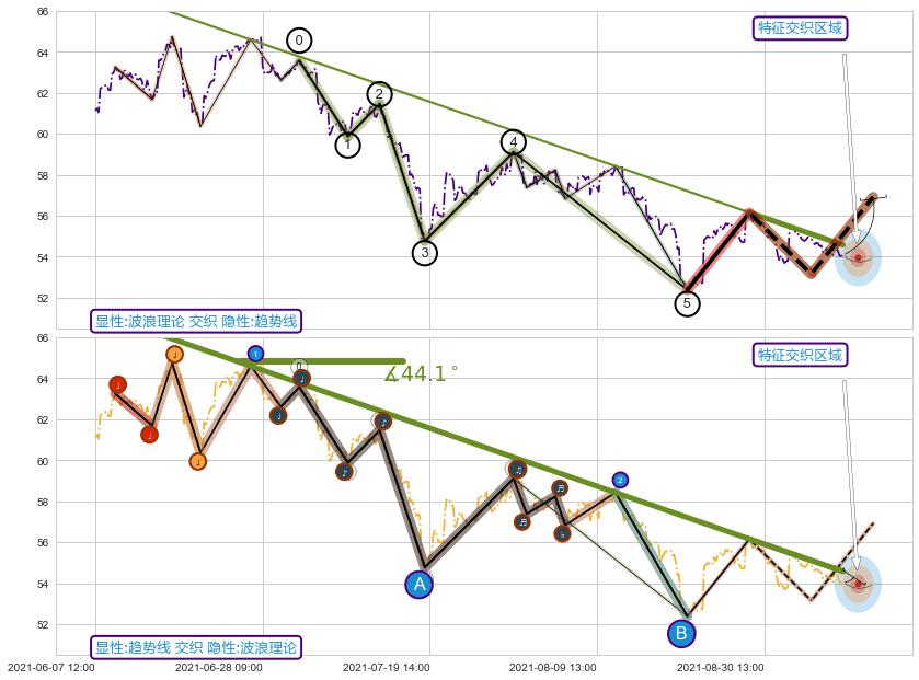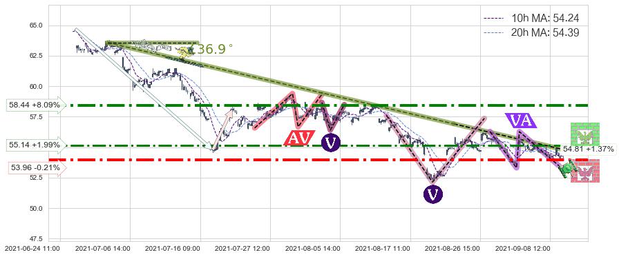 🦴 长线均值回复组合短线趋势跟踪[强阻力信号]2021-07-01 11:00-2021-08-23 14:00下跌趋势依然成立(下跌趋势跟踪依然存在),短线价格略微上行反弹(均值回复猜想),即将接近下跌趋势提供的未破位阻力价格:54.81。