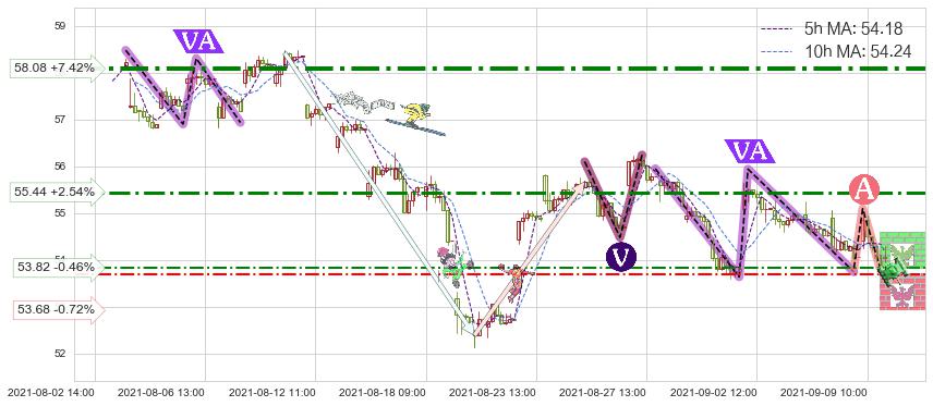 ♘ 阻力价格位55.44,可信任强度56.76%,距离最后交易2021-09-09 14:00形成的收盘价格54.07相差 +2.54%