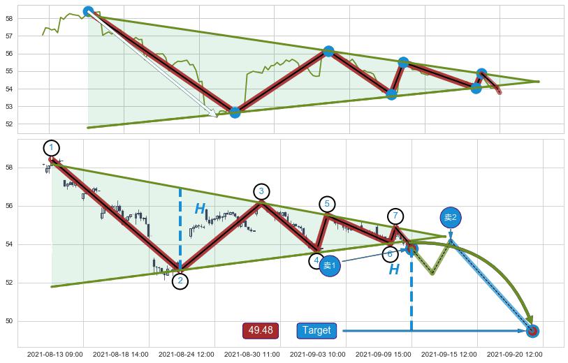 ➣ D点拟合预测价格53.04,距离最后交易收盘价格54.07相差 -1.90%