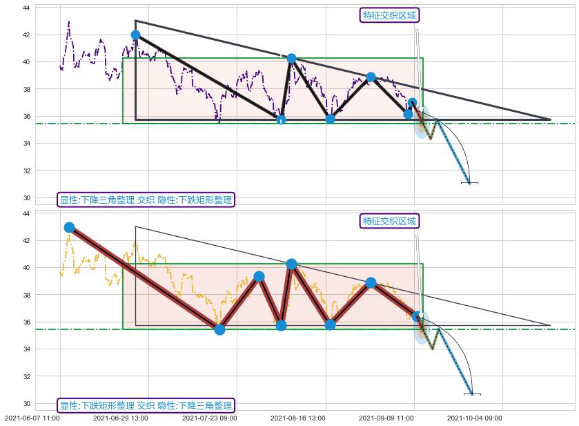 ➣ 下跌矩形整理:猜想临近关键支撑位突破点 → 临近拐点下跌 → 风险信号 → 大趋势均值回复