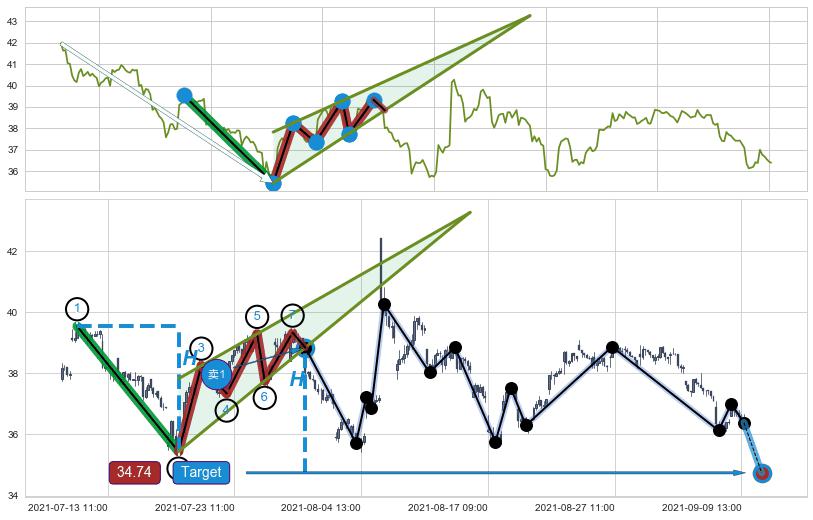 ➣ 升楔型:猜想预期下跌目标target即将达成,随后猜想强支撑来临,预期反弹上涨(均值回复)