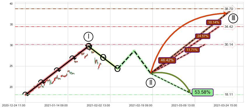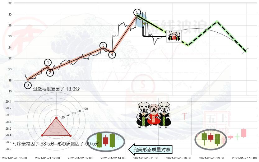 从2021-01-25 10:00至2021-01-28 16:00,共包含31个小时,阶段股价下跌-14.54%,阶段股价变动位移路程比: 1 : 2