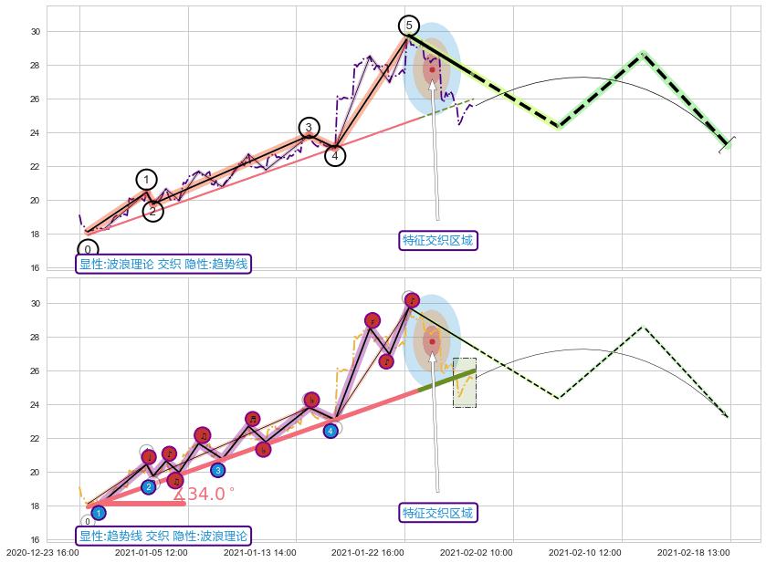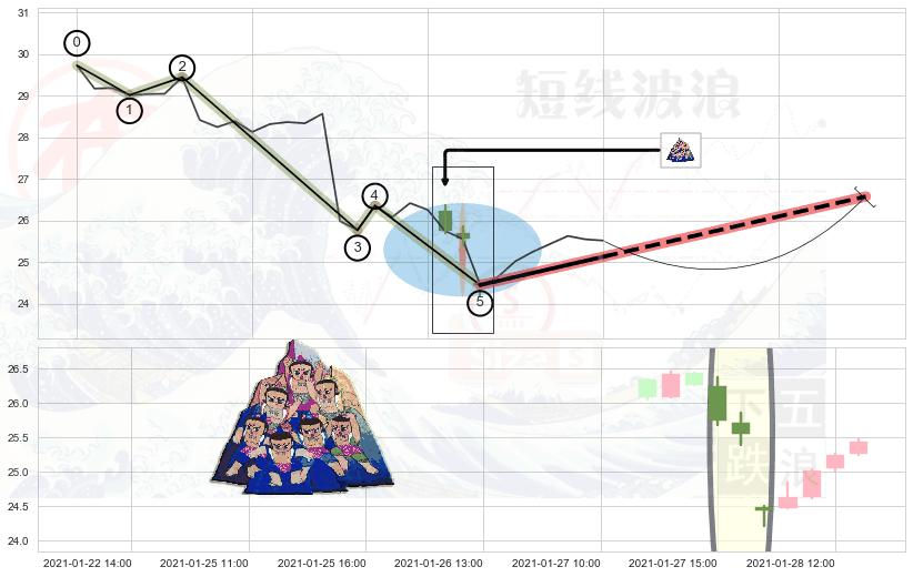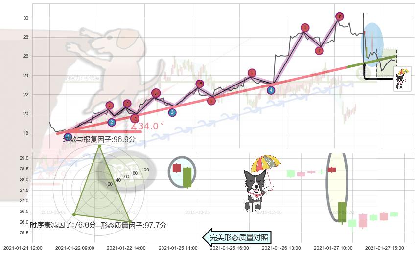 ➣ 2020-12-24 12:00-2021-01-25 15:00上升趋势存在反转[风险],虽然原上升趋势的支撑位(25.98)已破位,但其支撑效果尚存,原上升趋势角度: 34.0˚