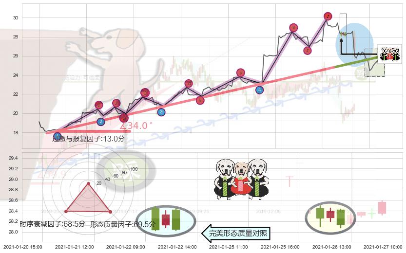 从2020-12-24 12:00至2021-01-25 15:00,共包含154个小时,阶段股价上涨49.52%,阶段股价变动位移路程比: 1 : 2,上涨趋势角度: 34.0,2021-01-19 09:00向⇪形成缺口,跳空上涨+13.26%