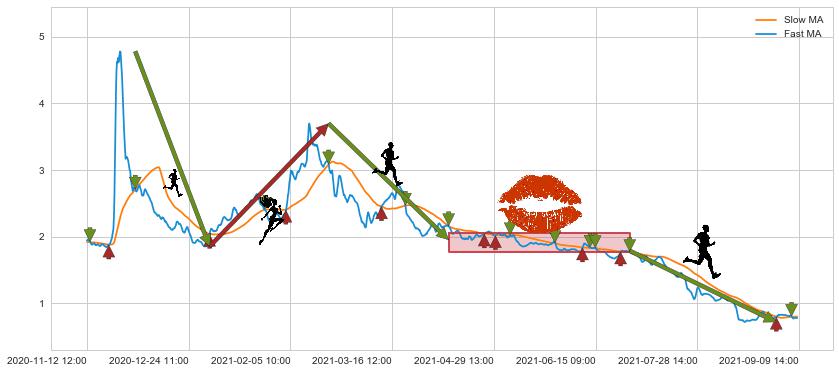 06-29 10:00至08-31 14:00 慢线与快线呈空头排列, 慢线与快线接触少,无缠绕