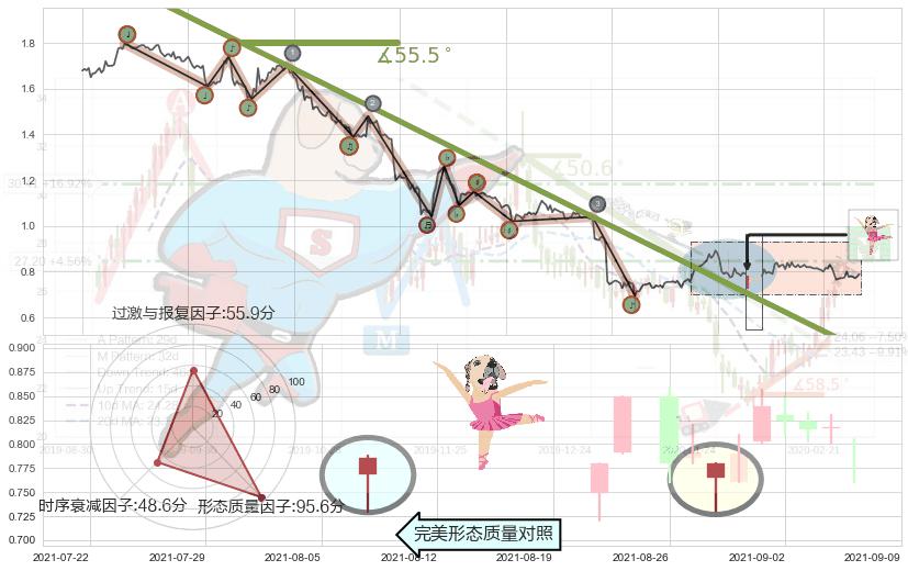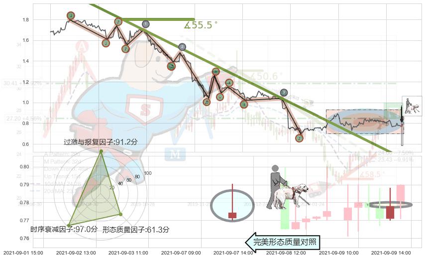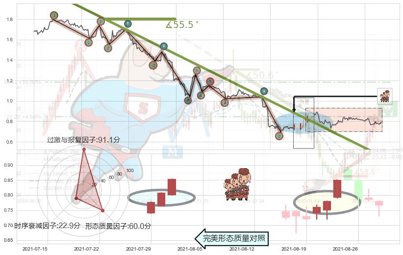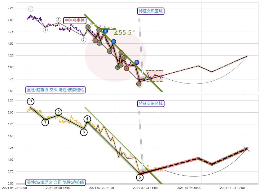 从2021-06-22 14:00至2021-08-24 10:00,共包含282个小时,阶段股价下跌-63.63%,阶段股价变动位移路程比: 1 : 5,下跌趋势角度: 55.5