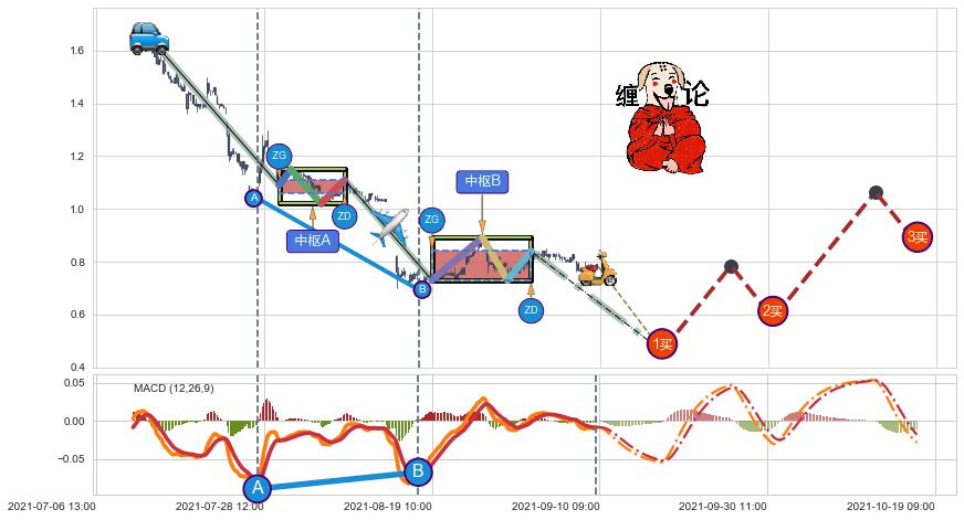 ➣ 缠论中枢点:下降缠中枢AB形成后猜想拐点1买即将出现,随后猜想后续持续拉升(均值回复)