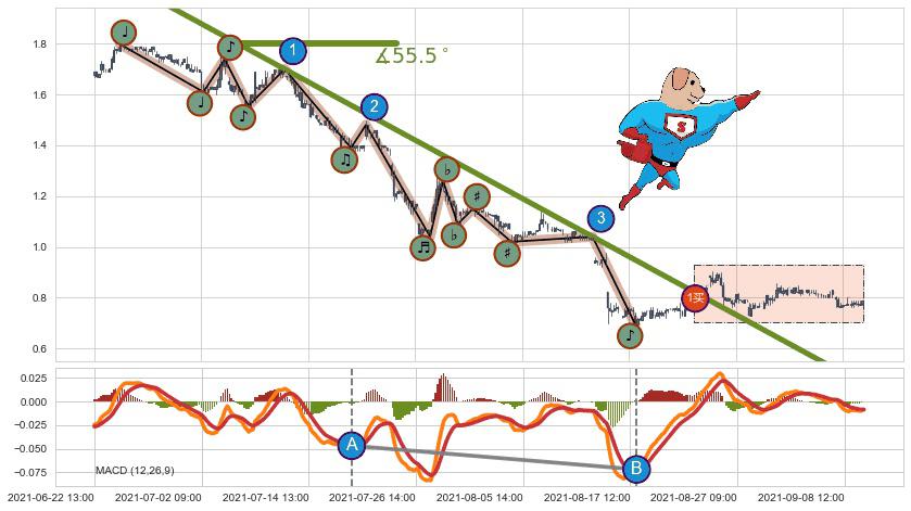 ➢ 2021-06-22 14:00-2021-08-24 10:00下跌趋势存在反转上涨[机会],其原下跌趋势的阻力位(0.46250)已被突破[强支撑信号],原下跌趋势角度: 55.5˚