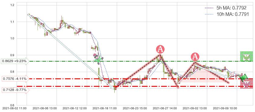 ♘ 支撑价格位0.7128,可信任强度63.56%,距离最后交易2021-09-09 14:00形成的收盘价格0.7900相差 -9.77%