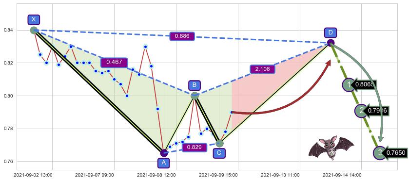 ➢ 谐波蝙蝠:b下跌接近c:猜想支撑性拉升 → 上涨 →【拐点】支撑临近 → 大趋势均值回复