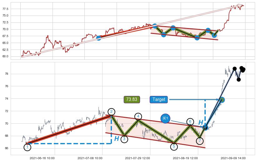➣ 最小中继整理涨幅→𝐇: 4.41 (上平行阻力线与下平行支撑线的垂直距离)