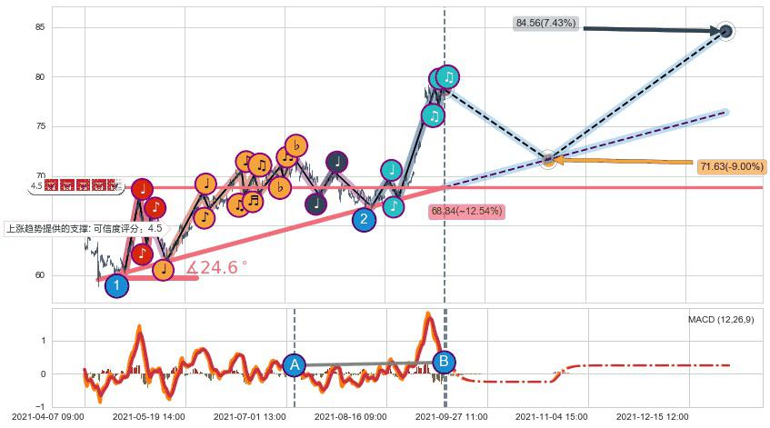 ♘ 在最后的上升阶段2021-04-13 10:00至2021-09-09 14:00存在 持续未破位的支撑位 ,支撑价格68.84,支撑可信任强度87.69%,其距离最后价格78.71相差 -12.54%