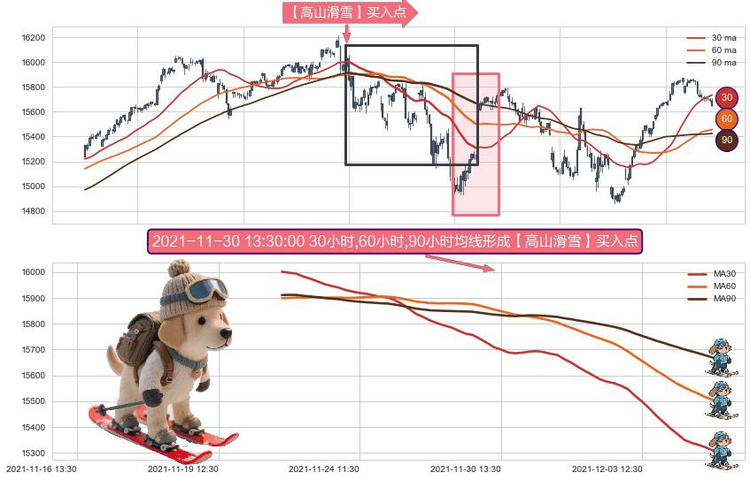形态多维评估: ⚀ 2021-11-22 14:30:00小时-2021-12-06 15:30:00小时显现 30小时-60小时-90小时均线 【高山滑雪】买入点 看多信号,后市看涨,买入