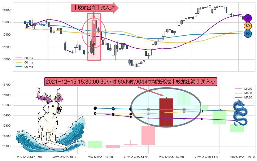 形态多维评估: ⚀ 2021-12-15 15:30:00小时显现 30小时-60小时-90小时均线 【蛟龙出海】买入点 看多信号,后市看涨,买入