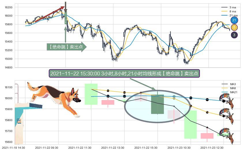 形态多维评估: ⚀ 2021-11-22 15:30:00小时显现 3小时-8小时-21小时均线 【绝命跳】卖出点 看空信号,后市看跌,卖出