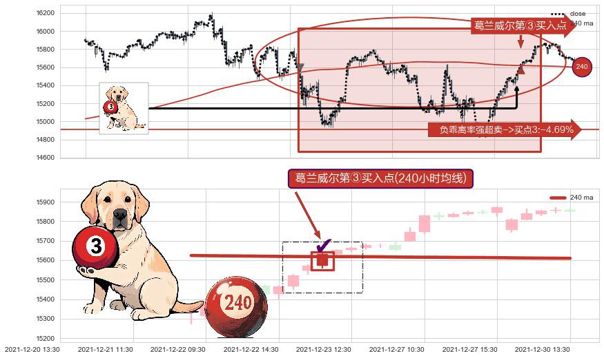 形态多维评估: ⚀ 2021-12-23 10:30:00-小时显现 葛兰威尔均线 240小时均线 第③买入点 上升趋势的中继信号,后市看涨,买进信号