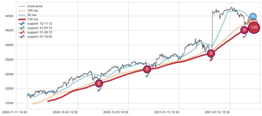 上涨趋势11-11 14:30-07-20 11:30,均线130确认关键支撑4处