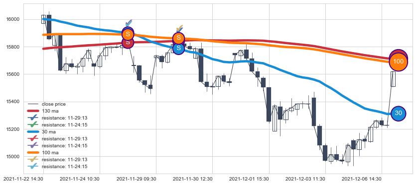 下跌趋势11-22 14:30-12-07 09:30,均线130, 100, 30确认关键阻力2处