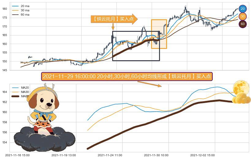 形态多维评估: ⚀ 2021-11-22 11:00:00小时-2021-12-06 10:00:00小时显现 20小时-30小时-60小时均线 【烘云托月】买入点 看多信号,后市看涨,买入