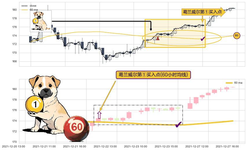 形态多维评估: ⚀ 2021-12-22 10:00:00-小时显现 葛兰威尔均线 60小时均线 第买①入点 走势反转见底信号,后市看涨,买进信号