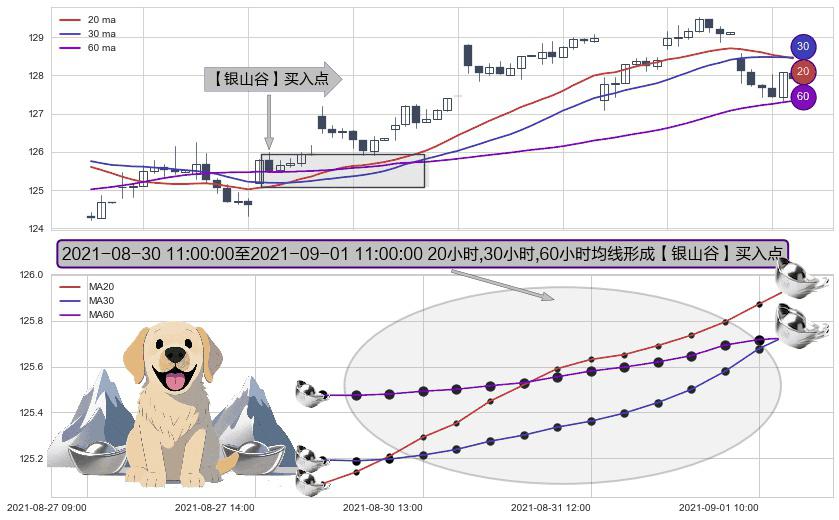 形态多维评估: ⚀ 2021-08-30 12:00:00-小时至2021-09-01 11:00:00-小时显现 20小时-30小时-60小时均线 【银山谷】买入点 看多信号,后市看涨,买入