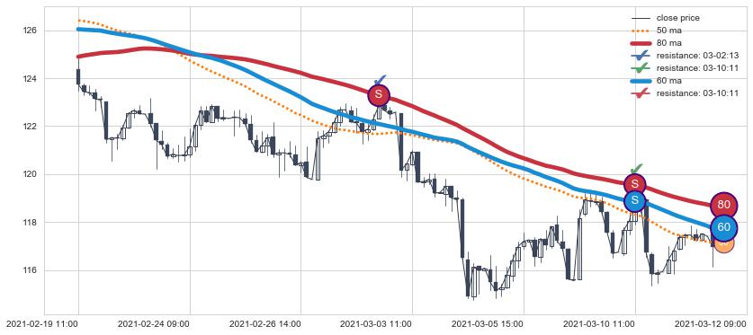 下跌趋势02-19 11:00-03-12 09:00,均线80, 60确认关键阻力2处