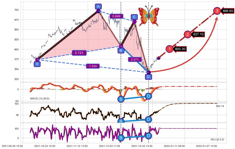 | 4 🅚:【高山滑雪】买入点 ➕ 📡:谐波蝴蝶已到达d点:猜想c下行到达d点后报复性拉升上涨(均值回复) ☞ 看多信号 ⇥ 【均线】交织【图形】⇥ 综合量化分数: 52 | > |