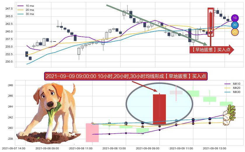 形态多维评估: ⚀ 2021-09-09 09:00:00小时显现 10小时-20小时-30小时均线 【旱地拔葱】买入点 看多信号,后市看涨,买入