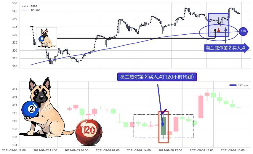 形态多维评估: ⚀ 2021-09-08 09:00:00-小时显现 葛兰威尔均线 120小时均线 第②买入点 上升趋势的中继信号,后市看涨,买进信号