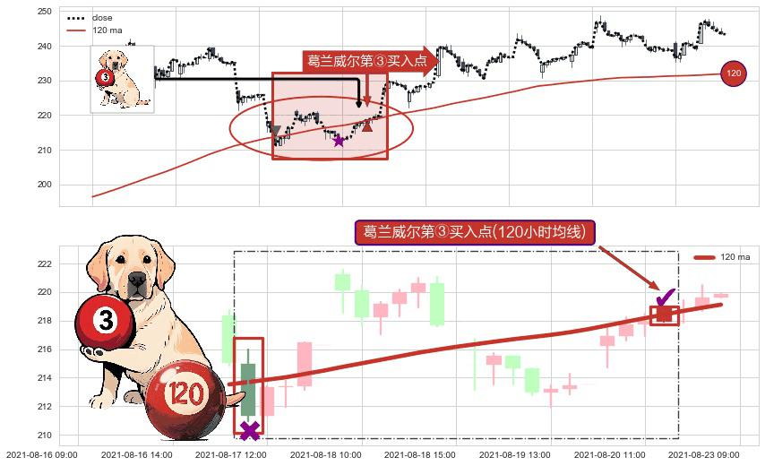 形态多维评估: ⚀ 2021-08-20 12:00:00-小时显现 葛兰威尔均线 120小时均线 第③买入点 上升趋势的中继信号,后市看涨,买进信号