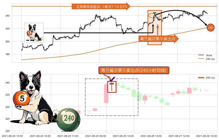 形态多维评估: ⚀ 2021-08-25 10:00:00-小时显现 葛兰威尔均线 240小时均线 第⑤卖出点 上升趋势均值回复的短线回落信号,后市看跌,卖出信号